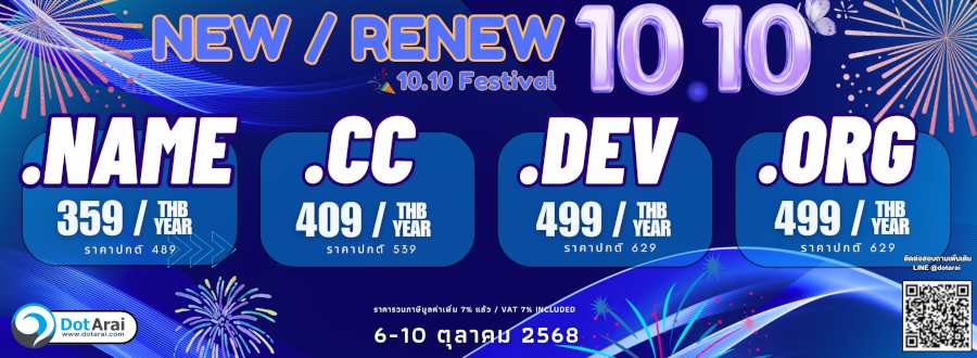 ดอทอะไรขอเรียนแจ้งให้ท่านทราบว่าทางทีเอชนิคได้มีการเปลี่ยนแปลงวงจรชีวิตชื่อโดเมน .th และ .ไทย และกำหนดให้มีค่าธรรมเนียมกู้คืนชื่อโดเมน ซึ่งจะส่งผลต่อโดเมน .th และ .ไทย สำหรับลูกค้าของบริษัท ดอทอะไร ดังต่อไปนี้